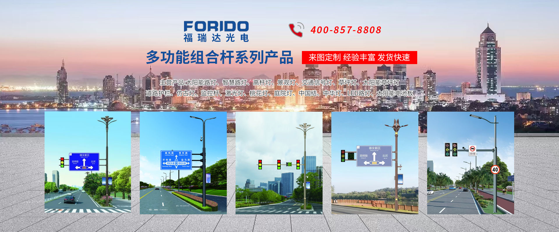 揚州福瑞達光電科技有限公司位于淮左名都歷史文化名城、中國路燈制造基地揚州市北郊菱塘工業(yè)園,公司占地面積76000平方米,注冊資金10518萬元,擁有高級技術(shù)嫻熟的員工280多人,擁有大型折彎機、激光切割、數(shù)控注塑機、壓鑄機、自動埋弧焊、氣焊、彩色粉末靜電噴塑等大型自動化設(shè)備,我公司是一家集設(shè)計、研發(fā)、生產(chǎn)、銷售、施工安裝服務(wù)為一體的戶外交通照明產(chǎn)品制造商,主要生產(chǎn)智慧路燈、太陽能路燈、LED路燈、高桿燈、景觀燈、交通信號燈、交通標(biāo)志牌、通信鐵塔、路跨鋼結(jié)構(gòu)、公交站臺、太陽能光伏組件、景點亮化、樓宇亮化工程的設(shè)計施工等。公司秉承開拓創(chuàng)新、銳意進取、精誠服務(wù)的企業(yè)精神,堅持以“誠信為本、技術(shù)為先、服務(wù)是金”的合作理念,我們憑借先進的制造工藝、優(yōu)質(zhì)的產(chǎn)品質(zhì)量、合理的市場價格和完善的售后服務(wù)贏得了廣闊的市場和客戶的信賴。 我公司已通過ISO9001質(zhì)量體系認證、ISO14001環(huán)境管理體認證,CQC產(chǎn)品認證,中國節(jié)能產(chǎn)品認證,通過“CCC”強制性產(chǎn)品認證,具有市政總承包,照明,交安,設(shè)計等資質(zhì)···
